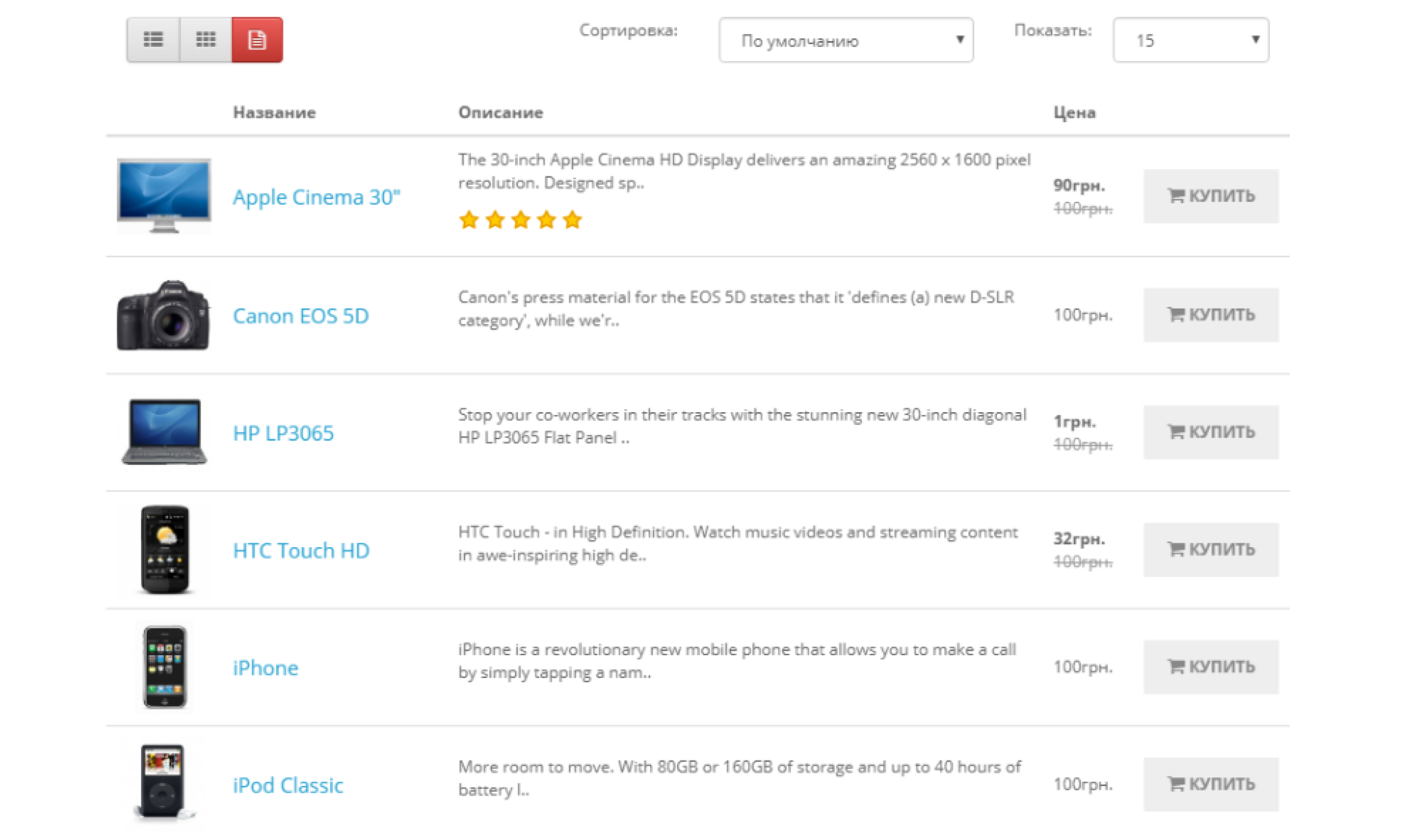 Можливо, корисним для великих каталогів товарів, адже таке розташування товарів у списку займає мало місця на сторінці і добре сприймається клієнтами під час перегляду списку.