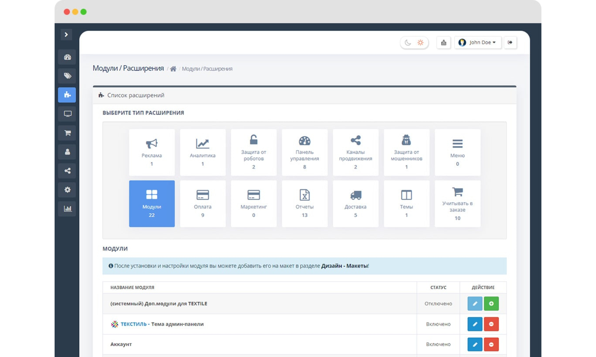 - Перейти до “(Розширення/Доповнення)” знайдіть модуль (Trxtile Admin Theme) або (TEXTILE (Стилізація адмін-панелі)) та активуйте його.