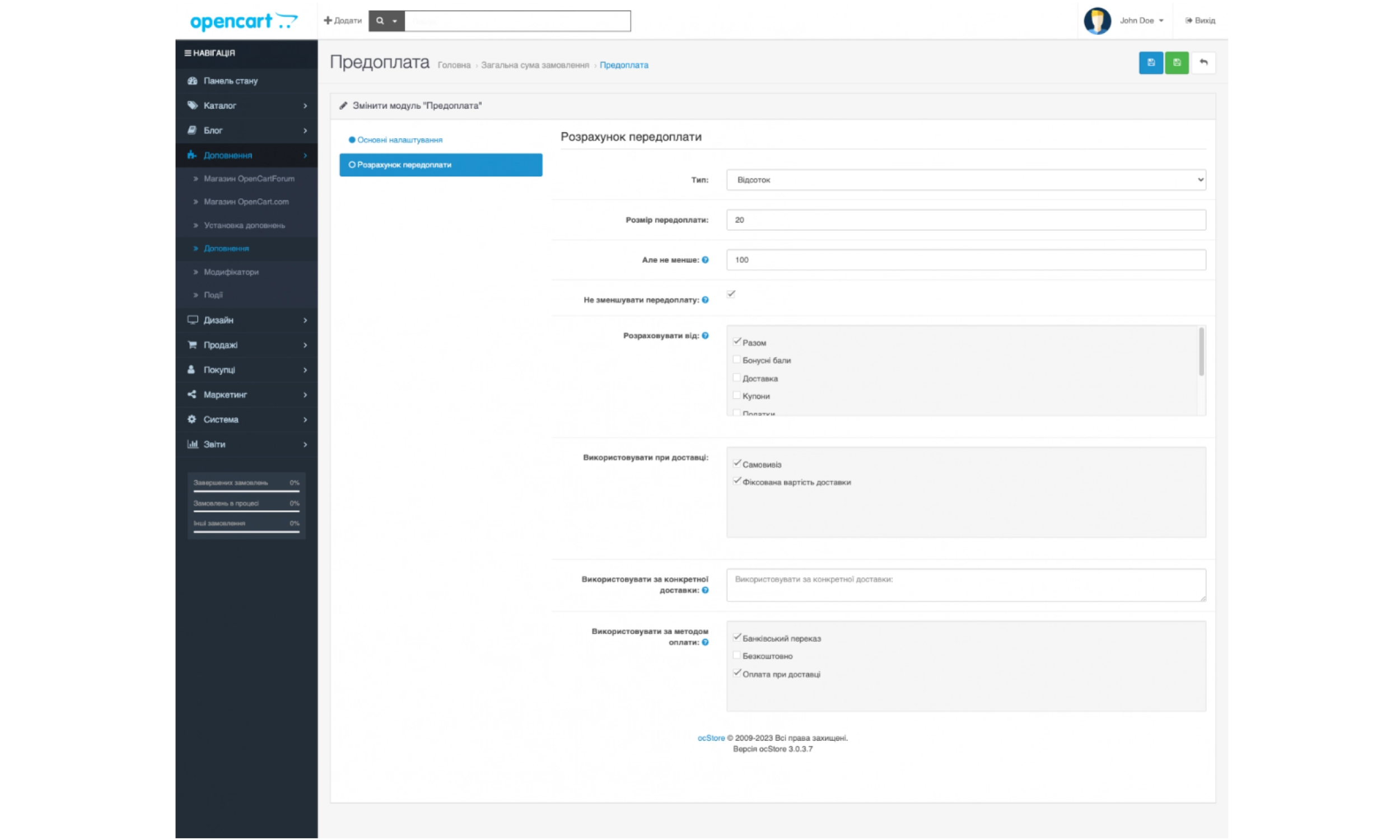 Модуль Передоплата в OpenCart є інструментом, що сприяє розрахунку попередньої оплати, яка залежить від вибраних параметрів замовлення. Ця передоплата може бути встановлена як у вигляді фіксованої суми, так і у відсотках від загальної вартості замовлення. Цікаво, що передоплата тісно пов'язана з різними методами доставки, що дозволяє врахувати різні тарифи та опції доставки при розрахунку передоплати.